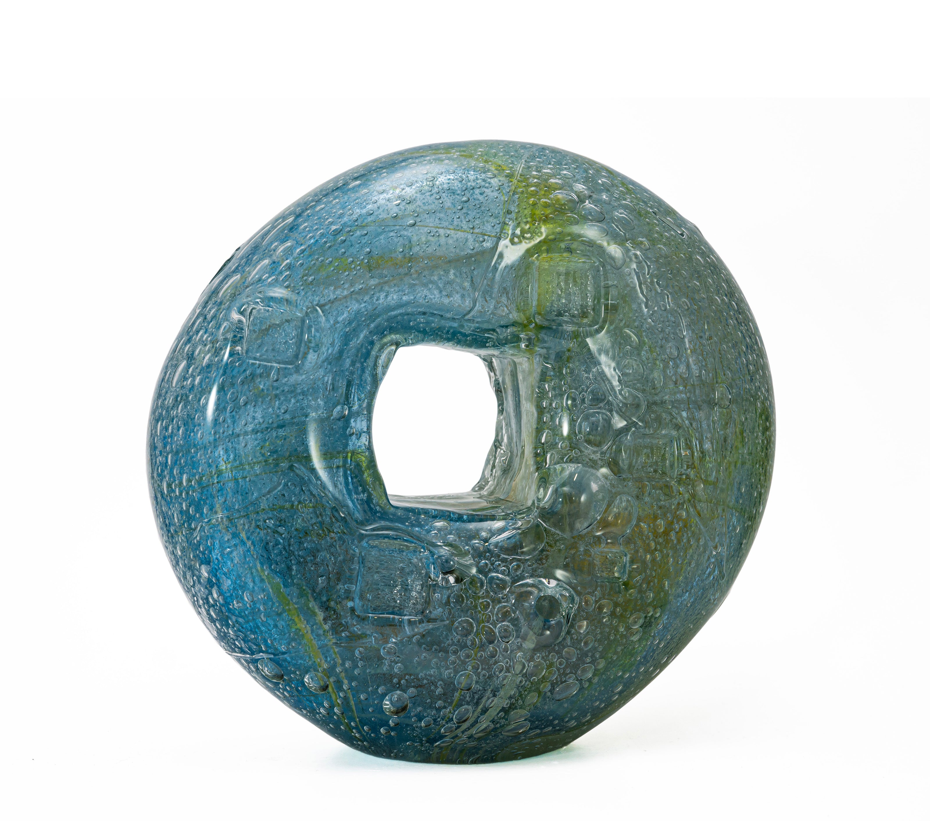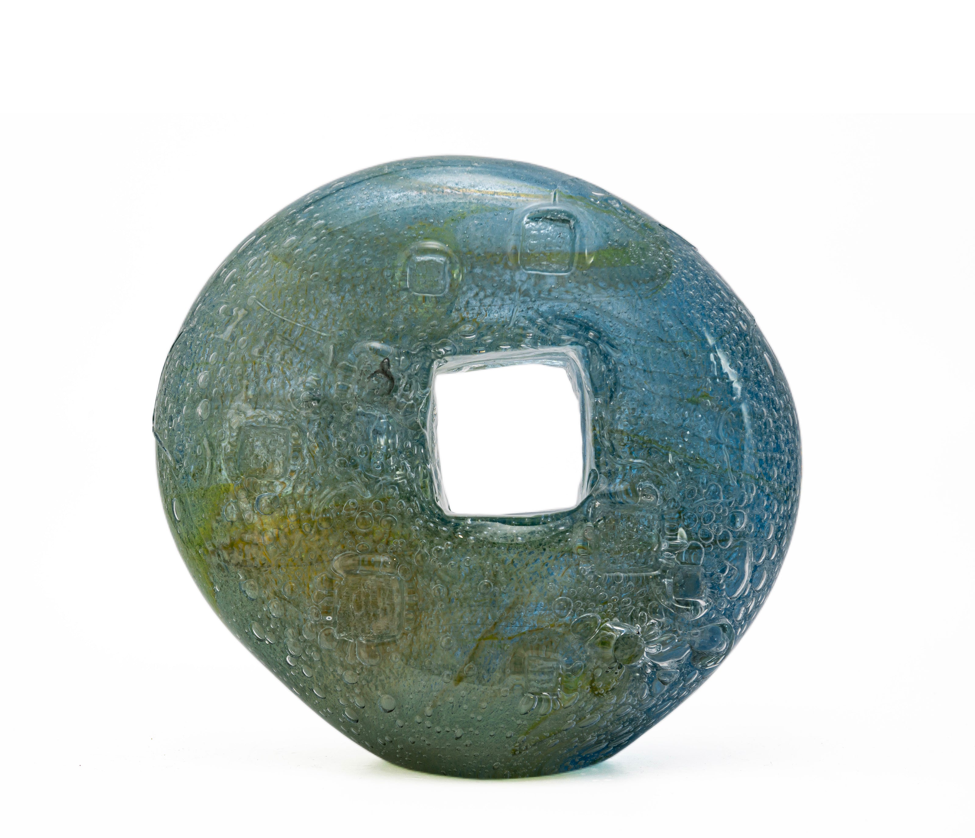 Inspired by the waters surrounding Chirakmana Cape, Chirakmana Depths captures the quiet tension of being suspended underwater, in that moment when silence, light, and breath converge. The glass’s fluid blue and green hues evoke the shifting tones of the sea, while bubbles rise as traces of air, moving toward an unseen surface. Within this space, stillness and motion coexist, creating a sense of peace filled with the subtle pulse of life pressing to return.