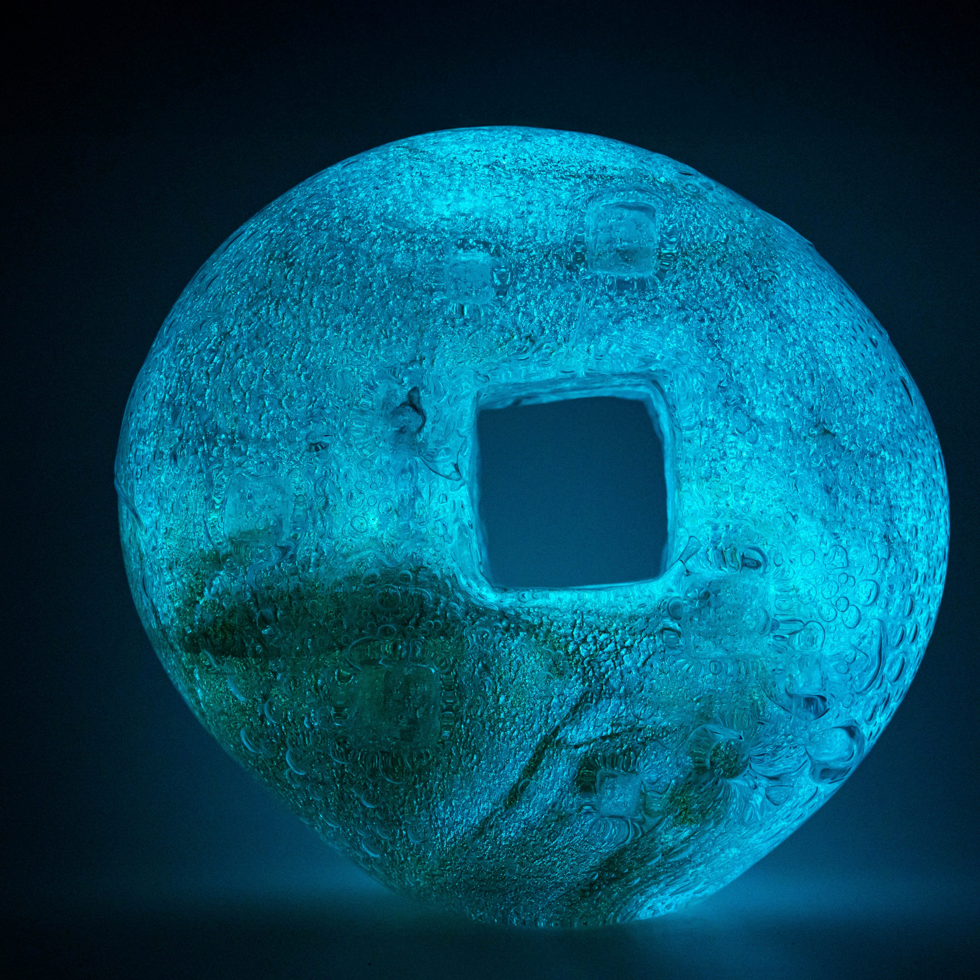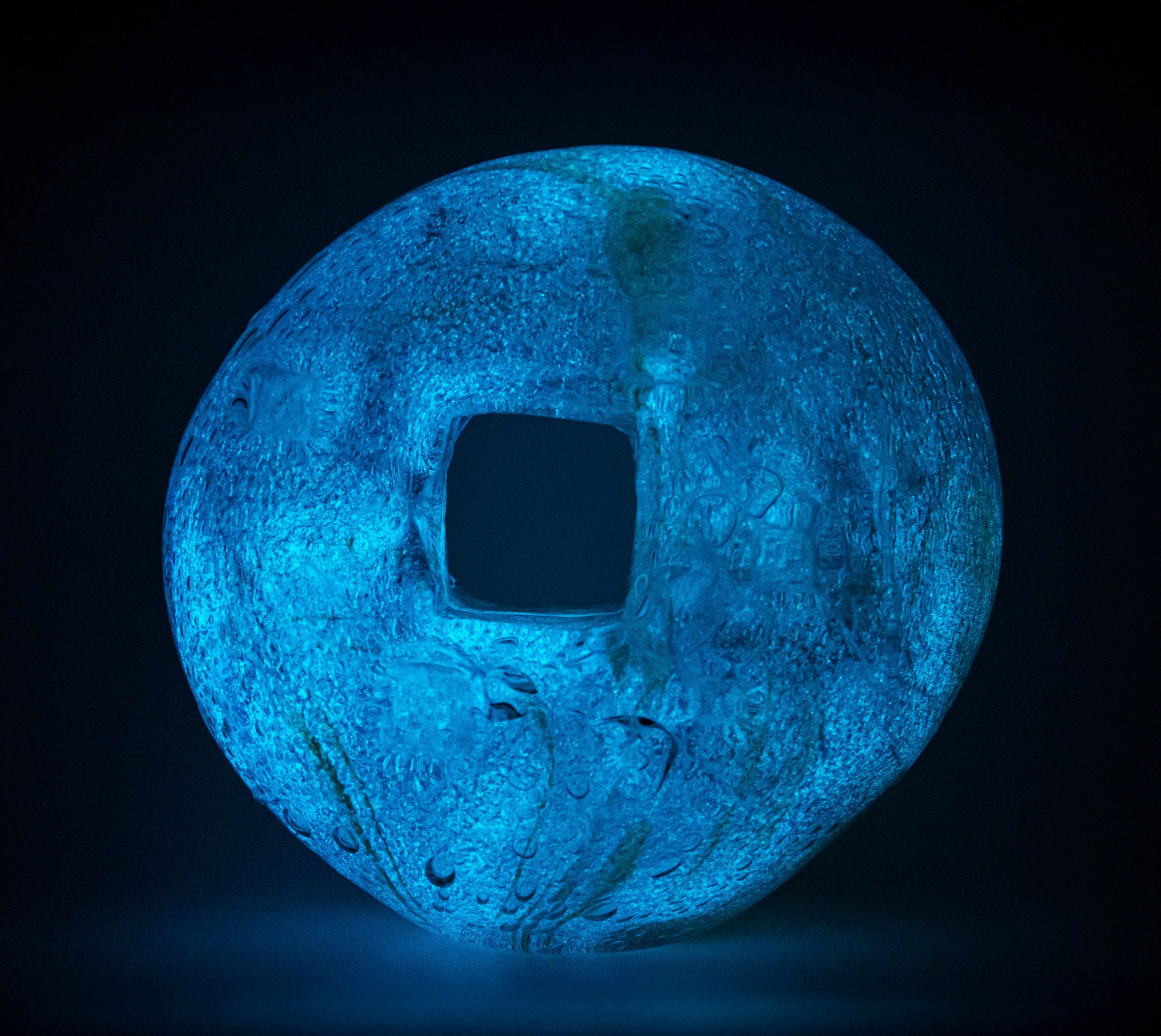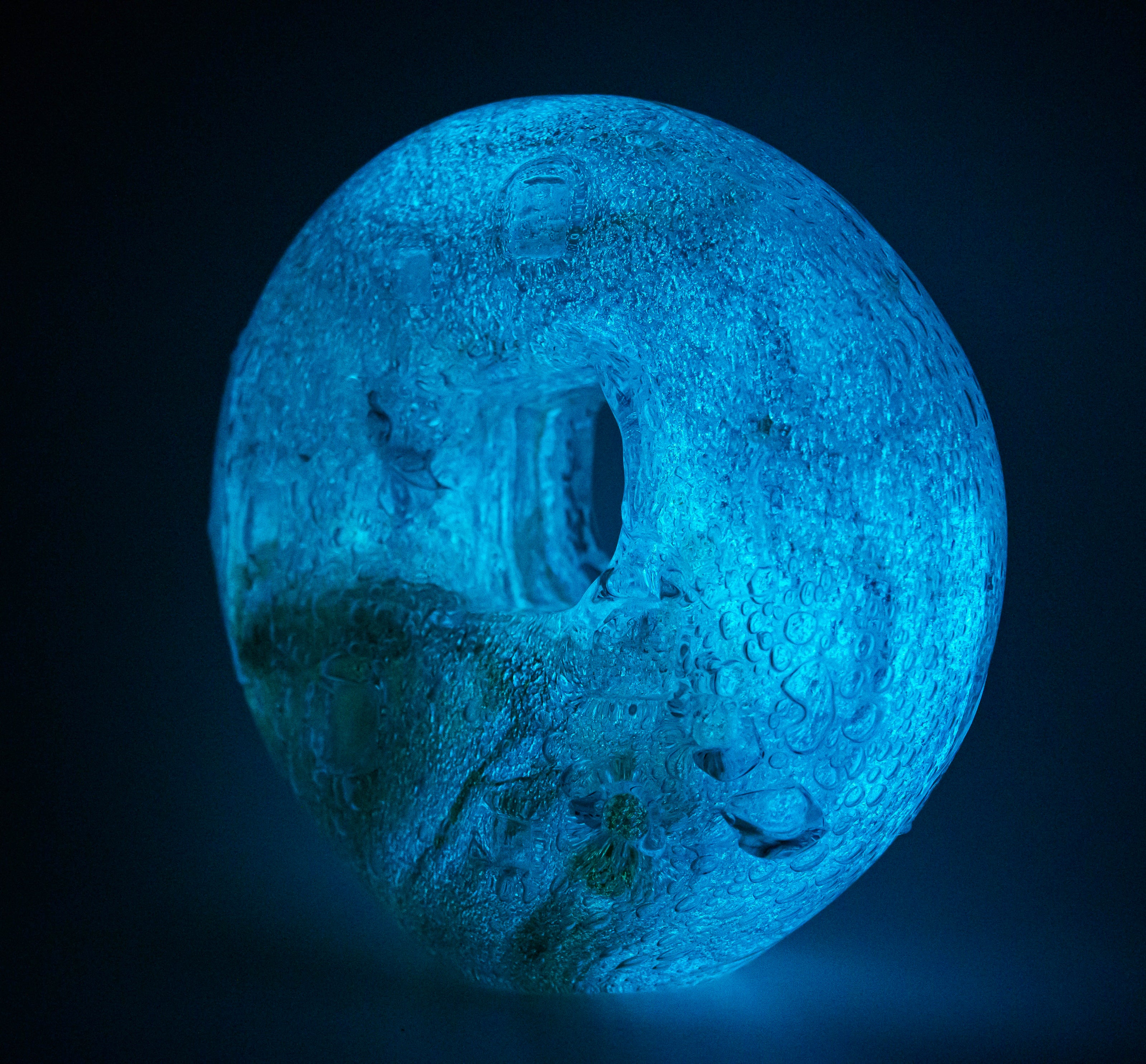 Infused with phosphorescent pigment, the piece absorbs light during the day and releases a soft glow in the dark, echoing the gentle luminescence found beneath the waves. The circular, open form suggests both a portal and a held breath, a meditation on the fragile boundary between immersion and emergence, freedom and constraint.