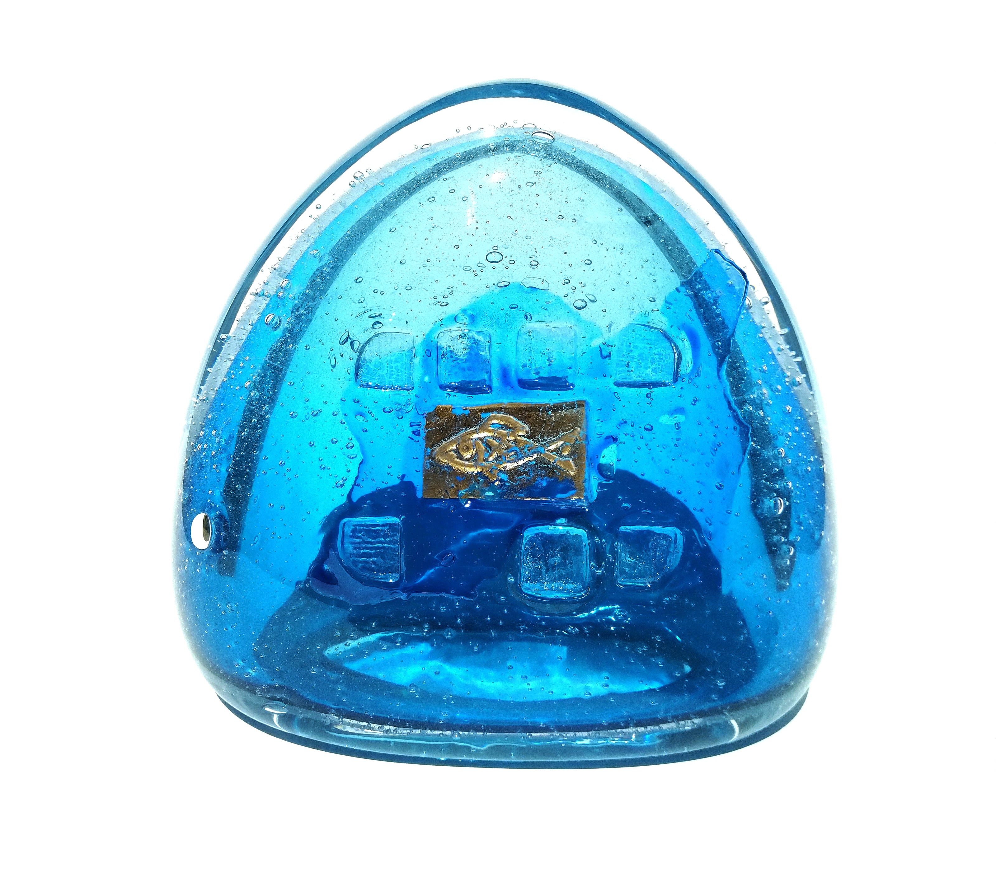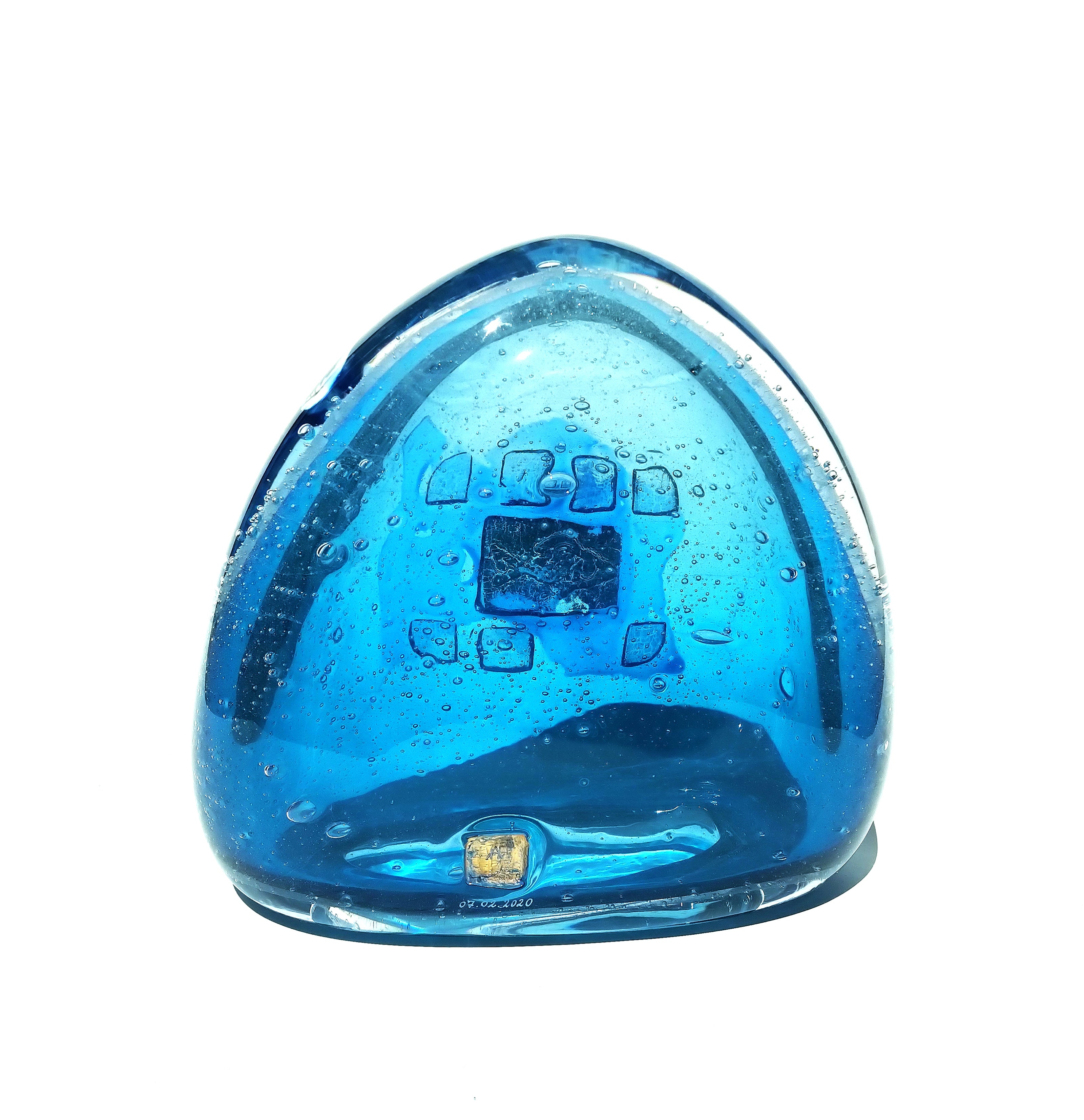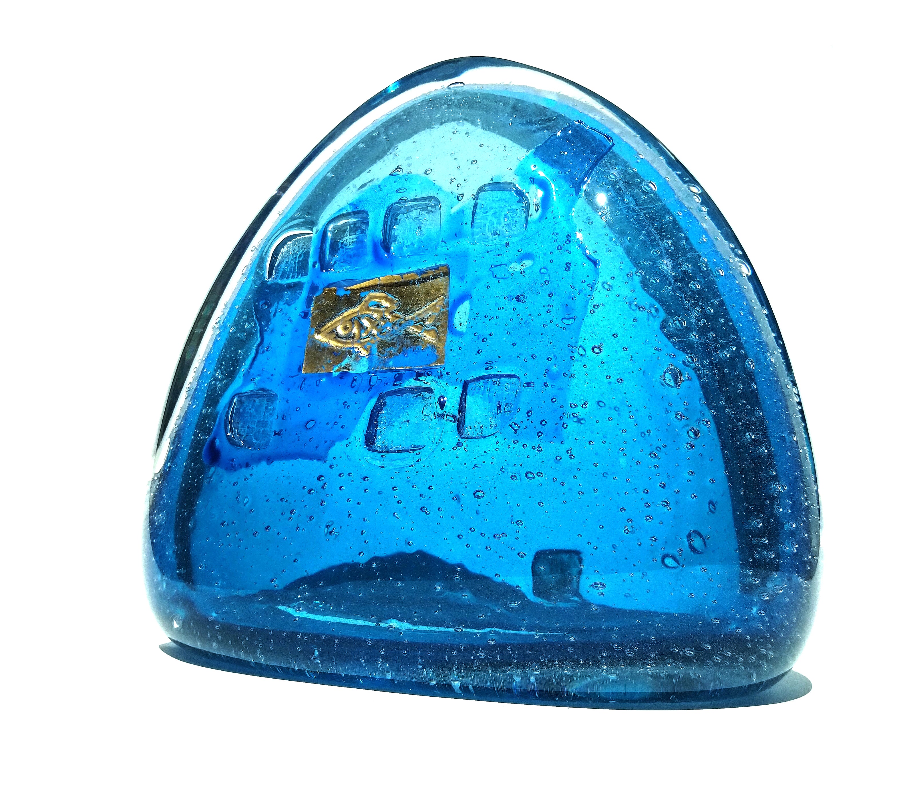 The deep blue glass suggests the vastness and mystery of the sea, a realm both nurturing and unforgiving. Tiny bubbles are suspended within, like captured breaths or rising waves, embodying the fragile balance between life and desire. At the heart of the piece, the golden imprint glimmers as both temptation and warning, a moment of beauty that asks for restraint. Goldfish invites contemplation on how easily abundance can dissolve when the line between need and greed blurs.