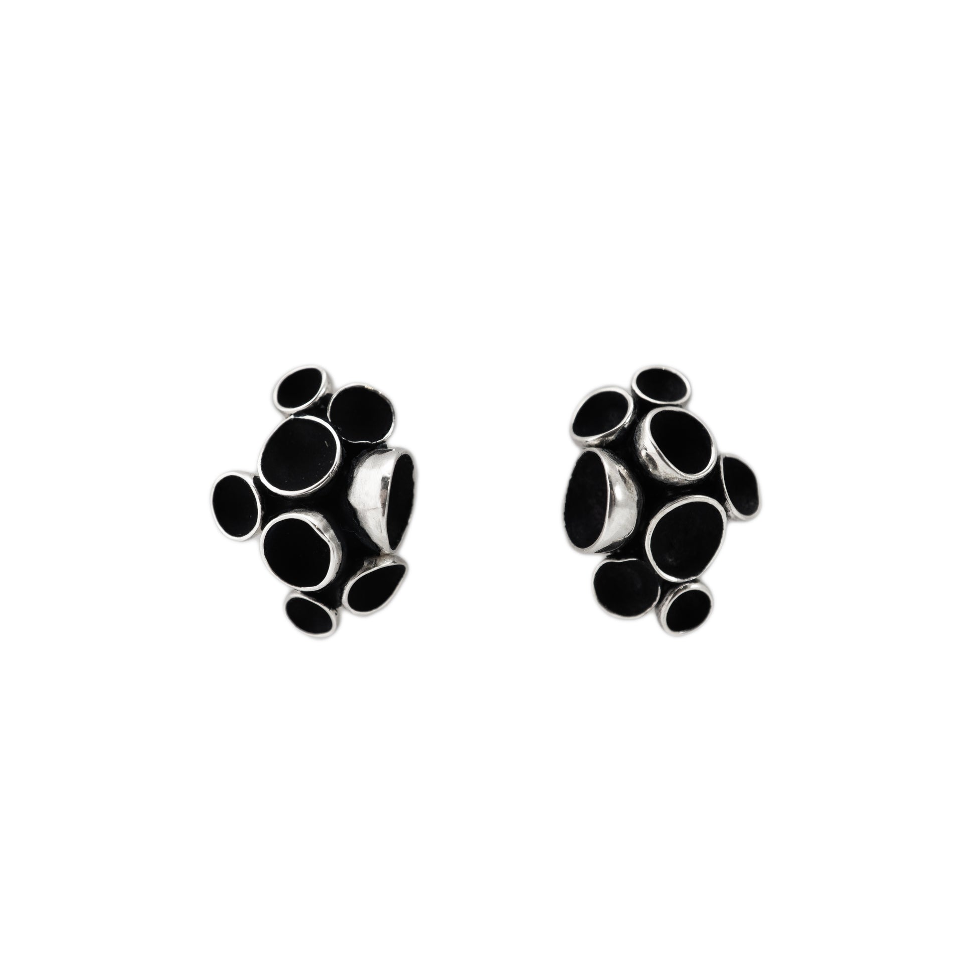 Bold earrings that expand the cluster form into larger, more sculptural shapes. The silver surfaces, accented with pigment, bring a sense of organic abundance. In black or teal, they make a statement while retaining their connection to natural subtlety.