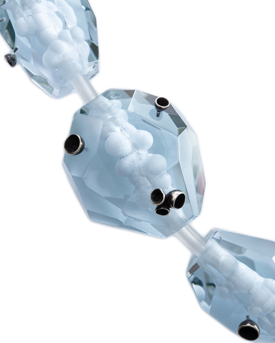 This statement necklace lies at the heart of the collection, uniting three asymmetrical glass elements into a bold, geometric composition. Each faceted piece is paired with silver cup insertions that evoke the delicate forms of Pezizaceae mushrooms, while subtle internal engravings create depth and reflection from within. The coloured glass, with its shifting green ultraviolet effect, transforms in the light to suggest growth, transformation, and symbiosis. More than adornment, the necklace stands between jewellery and sculpture, carrying a quiet yet powerful intensity.