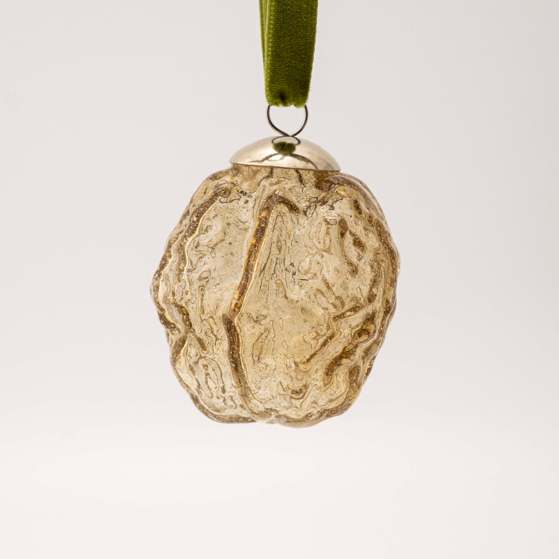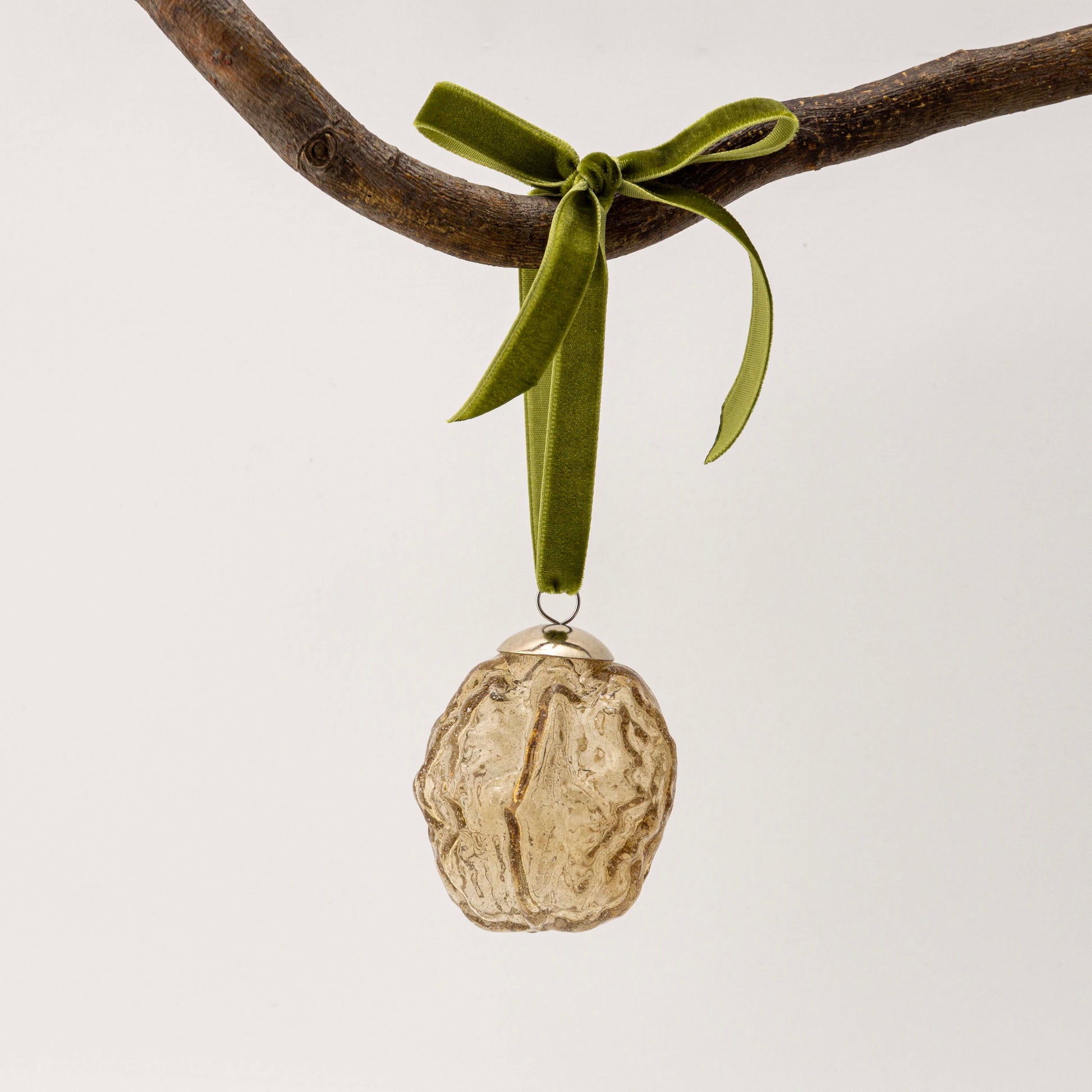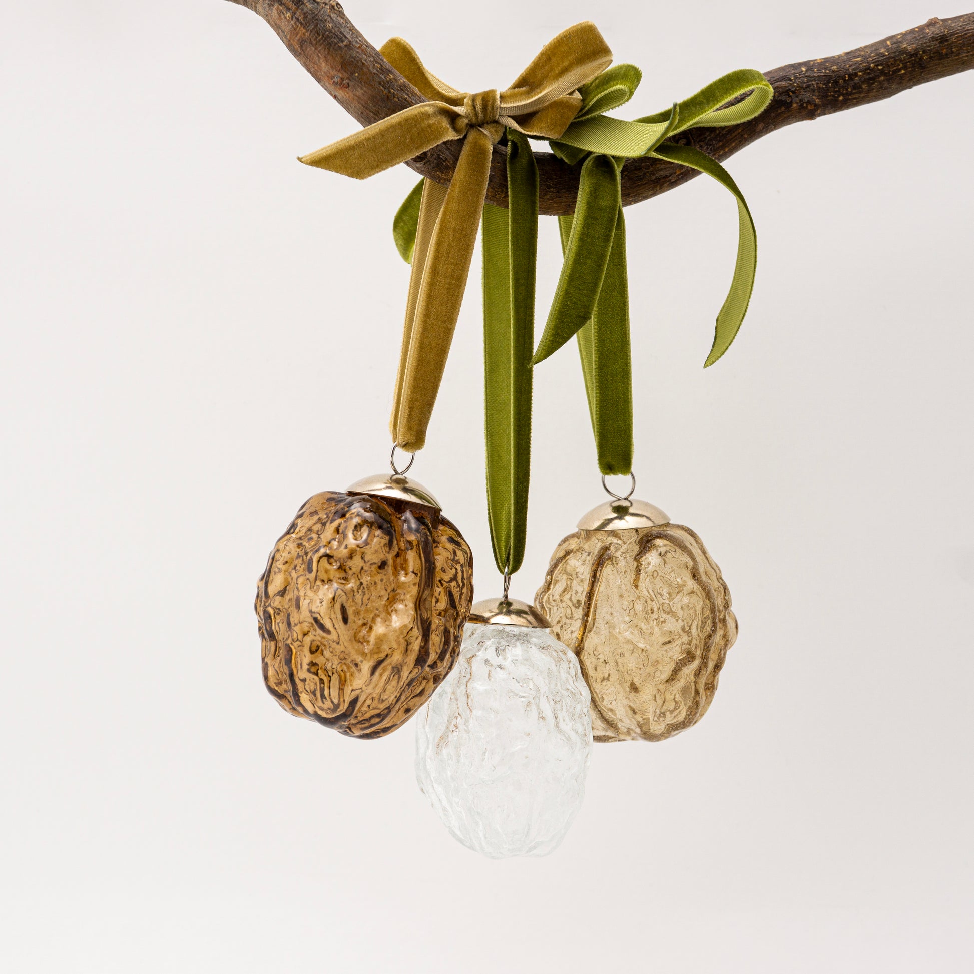 Each Walnut is individually hand-blown, making every piece subtly unique. Variations in shape, transparency, and color arise naturally from the handmade process, ensuring no two ornaments are alike.